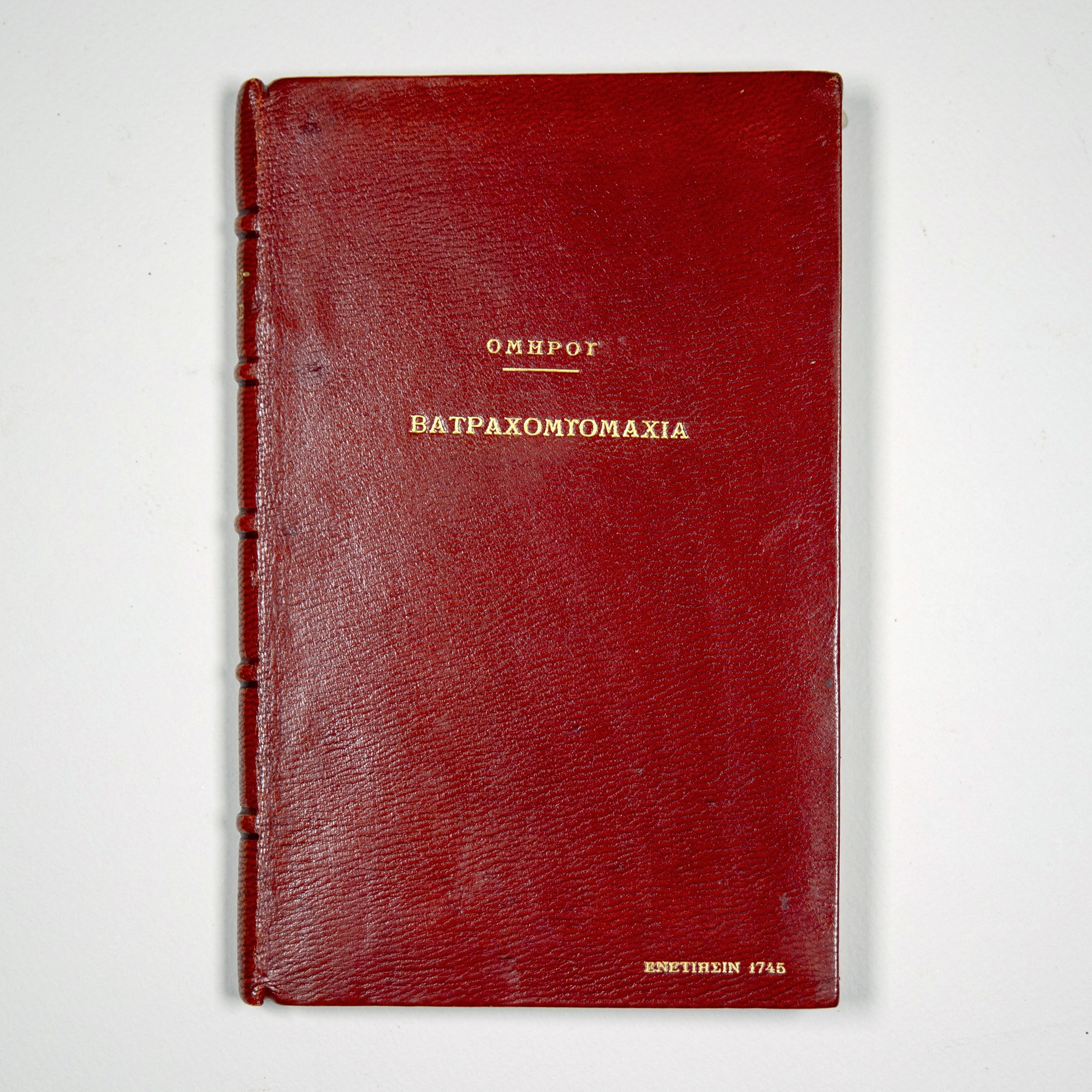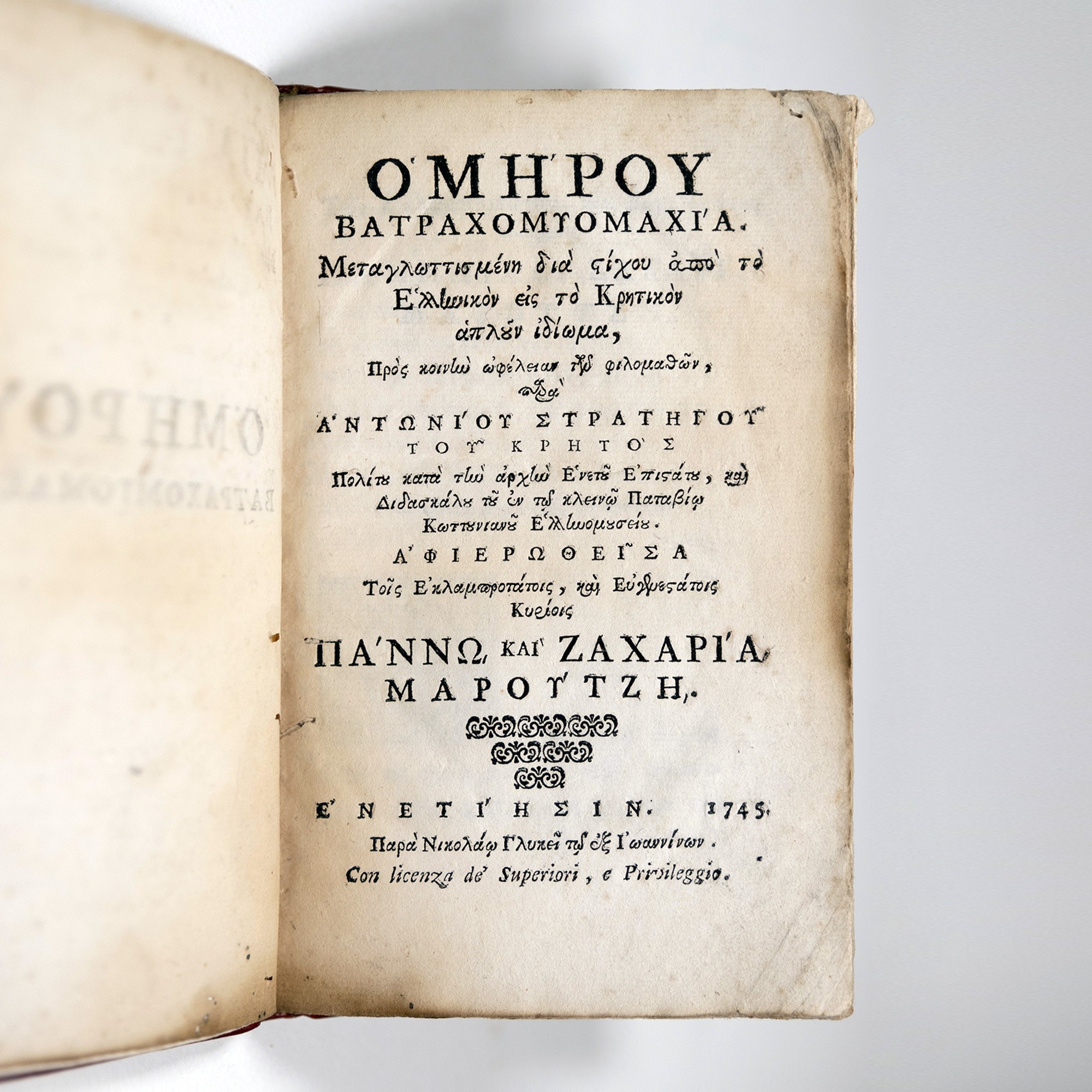 Translation of Vatrachomyomachia into the Cretan idiom by the scholar Antonios Strategos (1692-1758), from Corfu, originally from Crete, Director of the Kottounian College in Padova. Printed in Venice at the Greek printing press of Nikolaos Glykis.