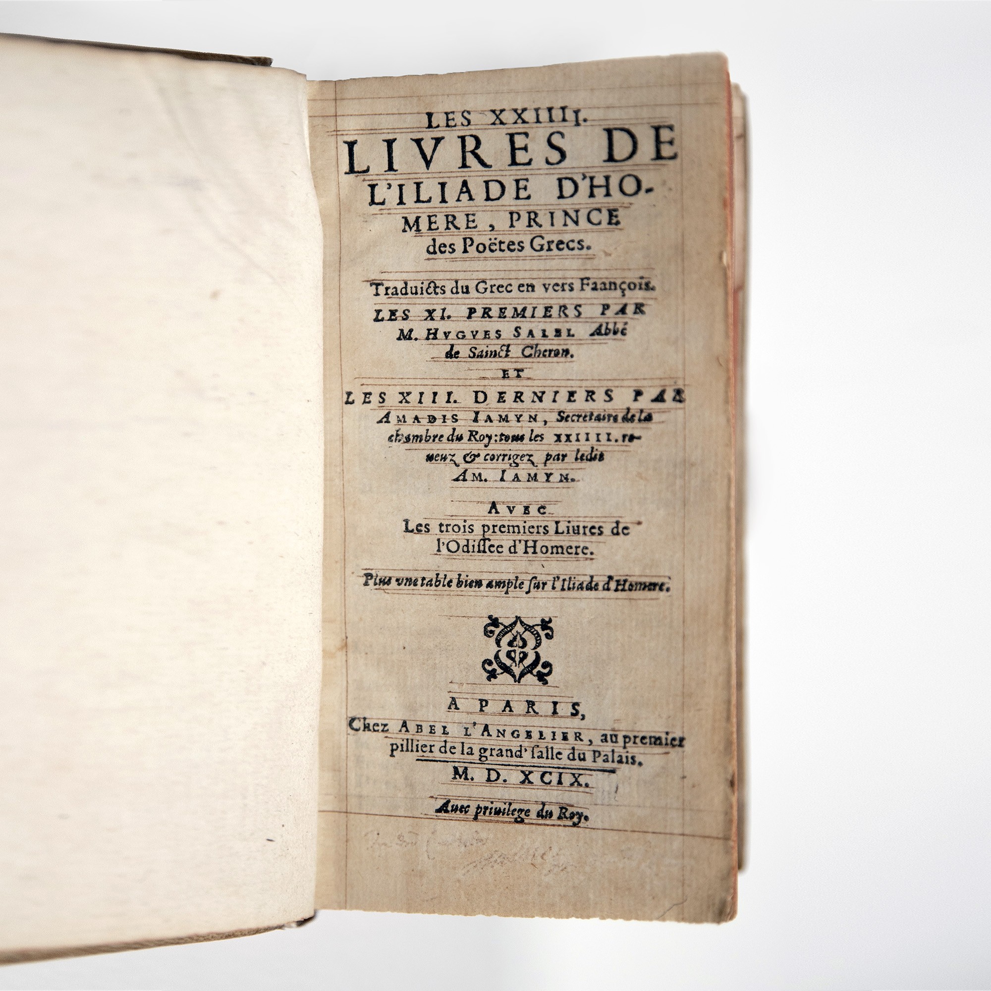 Les xxiiii. livres de l’Iliade d’Homère, prince des poëtes grecs traduicts du grec en vers François. Les XI. premiers par M. Hughes Salel et et les XIII. derniers par Amadis Iamyn … Avec les trois premiers livres de l’Odissée d’Homère. A Paris: chez Abel l’Angelier, 1599.