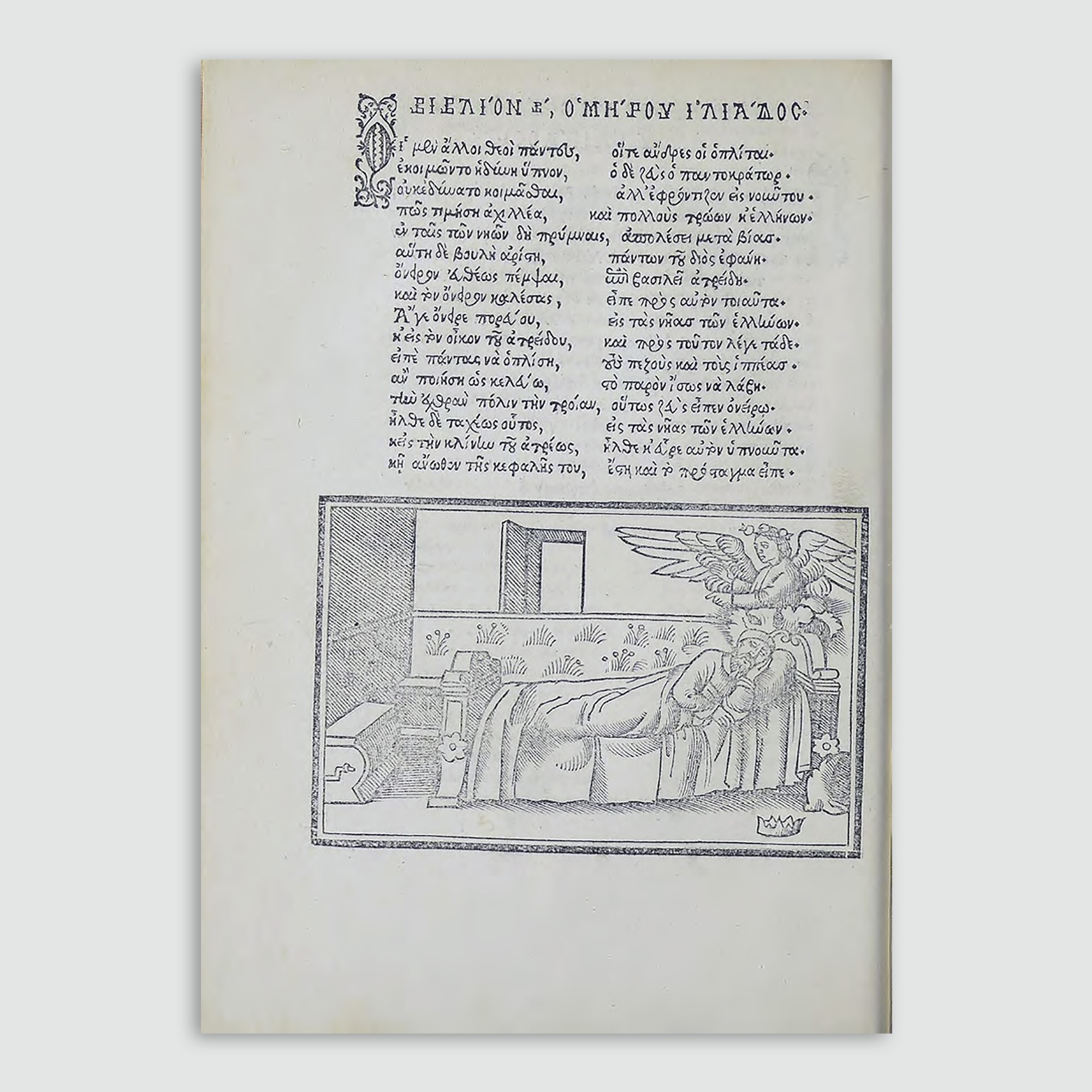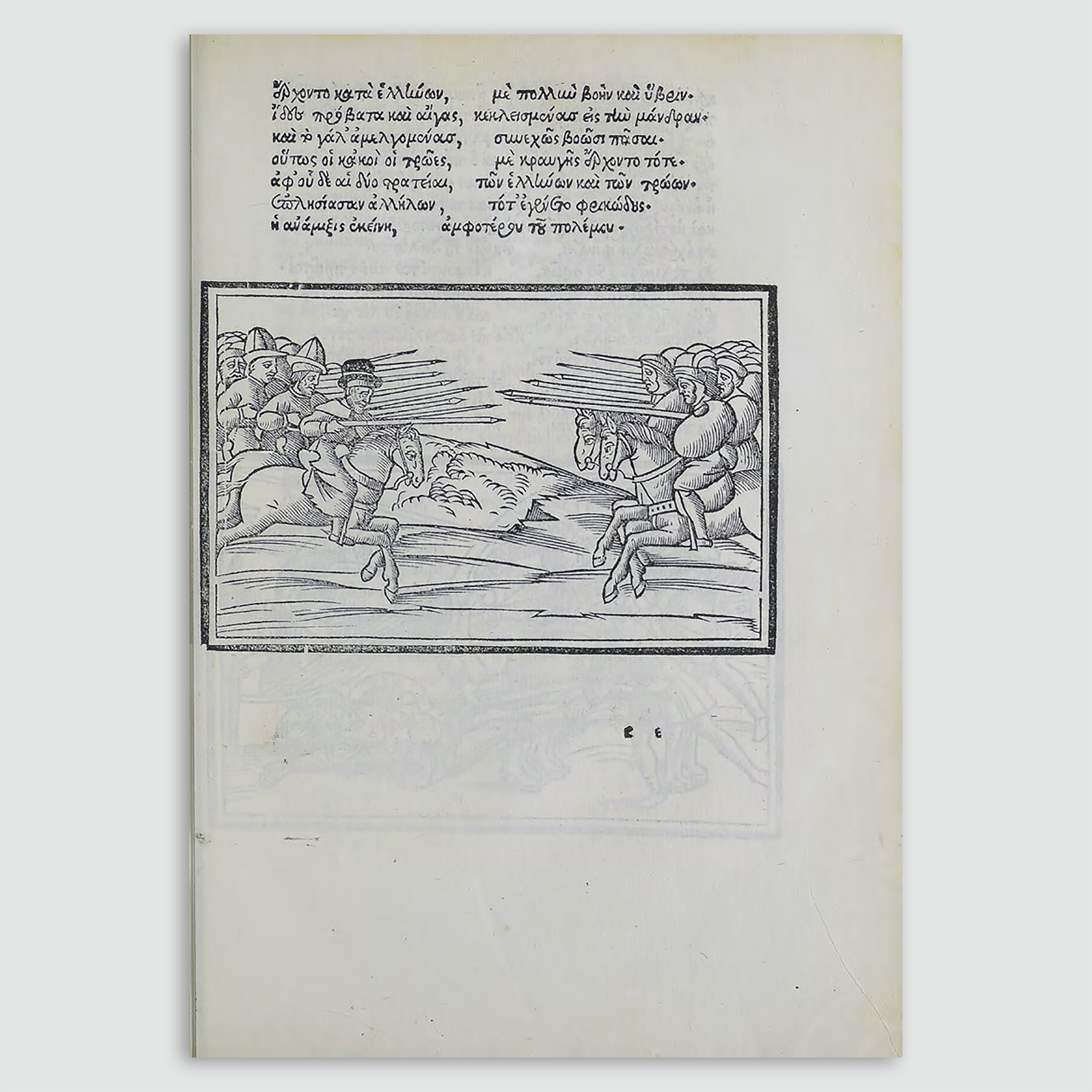 An abridged modern Greek paraphrase of the Iliad by 16th-century Greek scholar Nikolaos Loukanis, based on an earlier 14th-century paraphrase by Konstantinos Hermoniacos. The edition is adorned by 138 woodcuts that passed from printer to printer and were used to illustrate editions of vernacular Greek novels. The work was printed in Venice in 1526 by the humanist printer and publisher Stefano Nicolini da Sabbio (1512-1564). In the Collection of Joannes Gennadius there are copies of two later editions of 1603 and 1640 printed in the well-known Venetian printing press