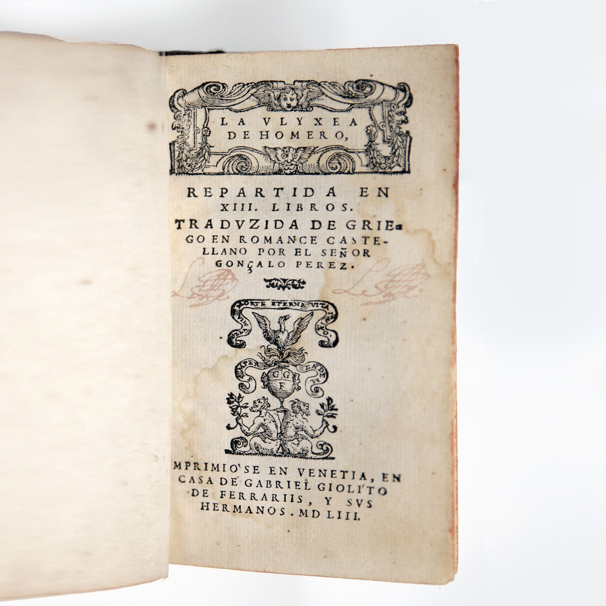 La Ulyxea de Homero, repartida en XIII libros traduzida de griego en romance castellano por el Senor Gonçalo Perez. Imprimiòse en Venetia: en casa de Gabriel Giolito de Ferrarriis, y sus Hermanos, 1553.