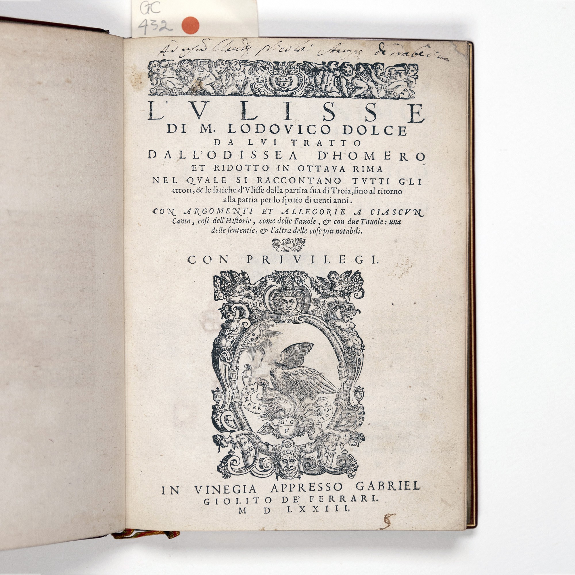 L’Ulisse di M. Lodovico Dolce da lui tratto dall’ Odissea d’Homero et ridotto in ottava rima … con argumenti et allegorie a ciascun canto. In Vinegia: appreso Gabriel Giolito de’ Ferrari, 1573.