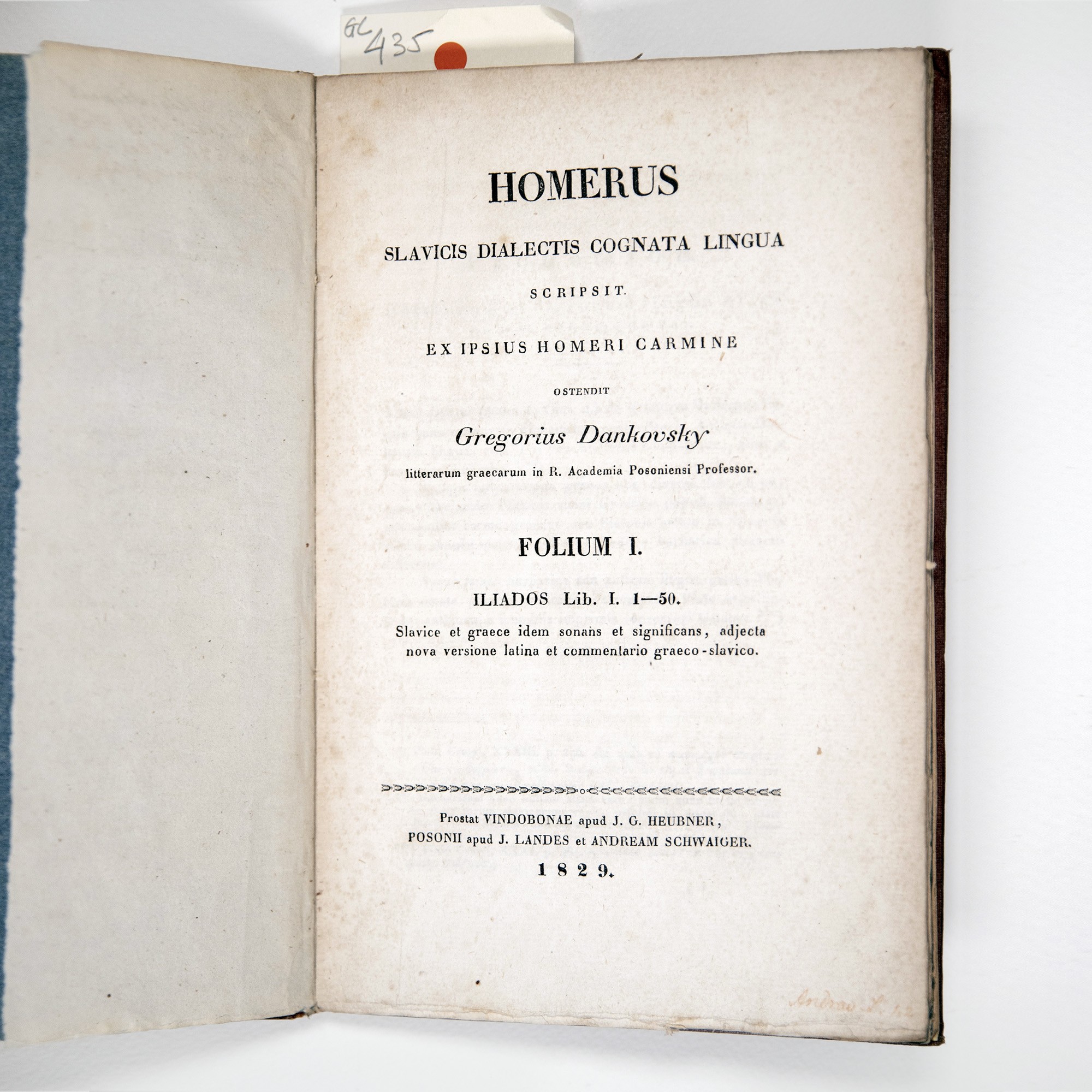 Study by the Czech linguist Gregor Dankovszky (1784- 1857) on the relationship between Homeric and Slavic languages. Published in Vienna.